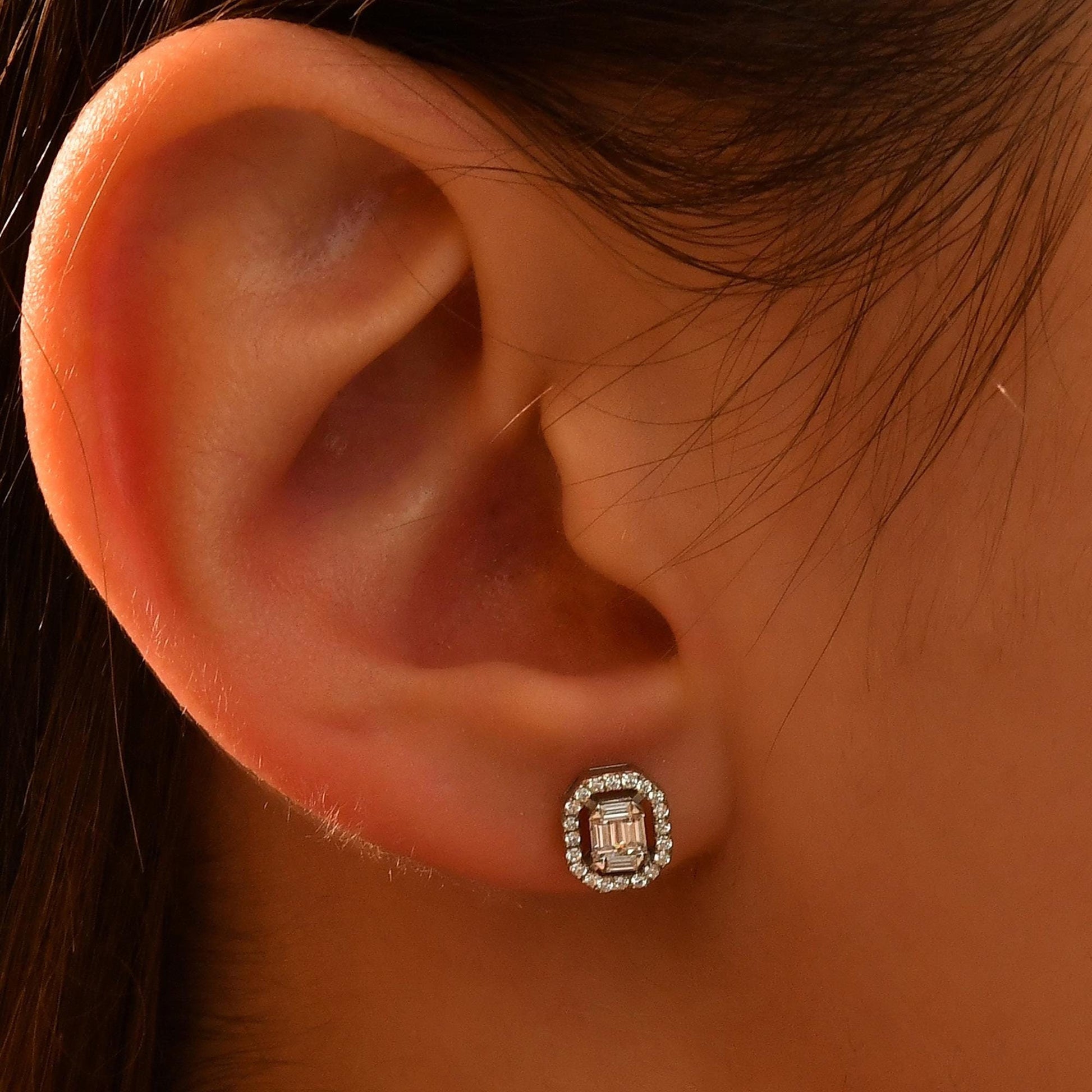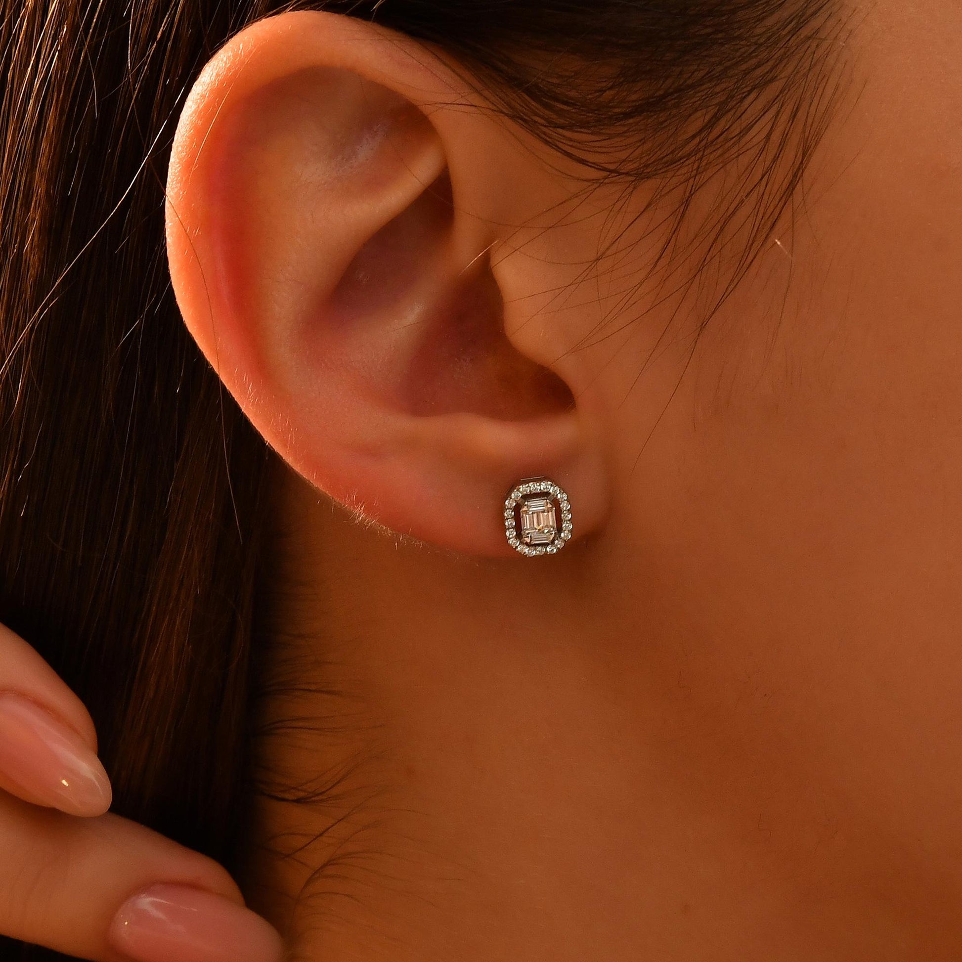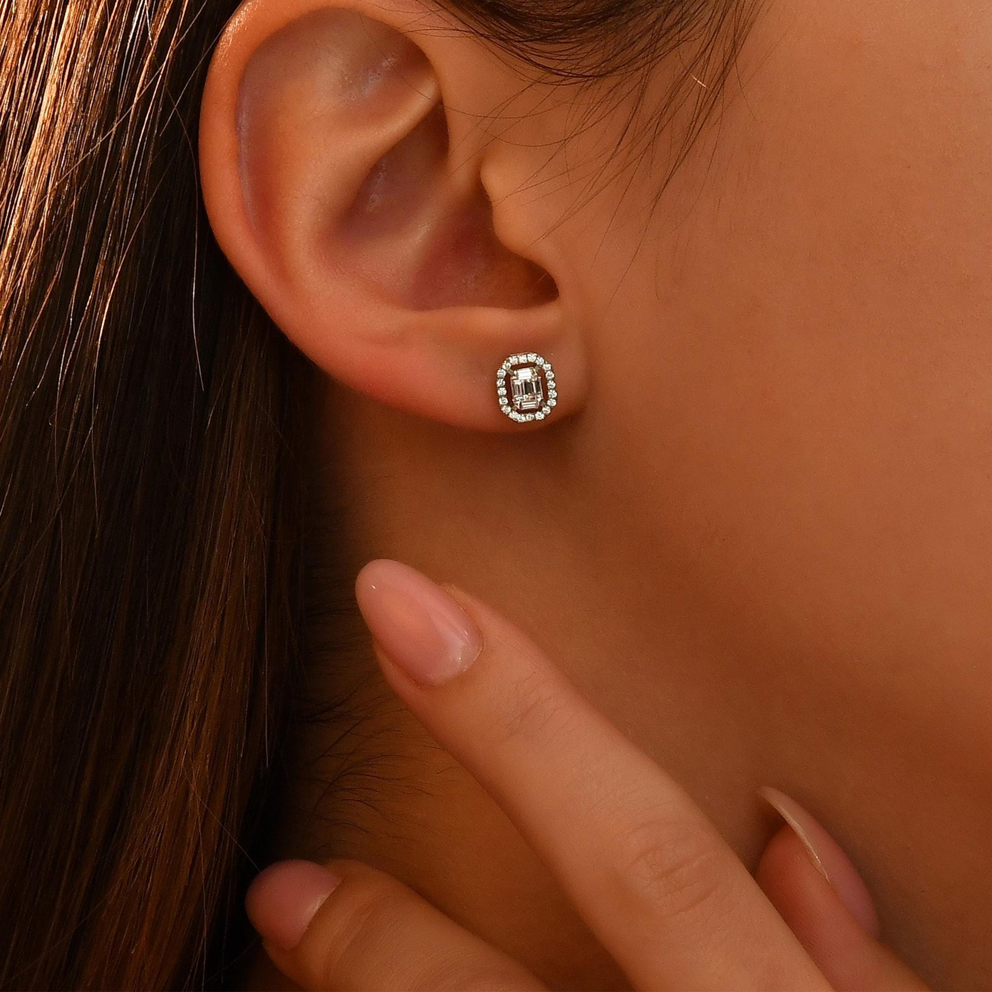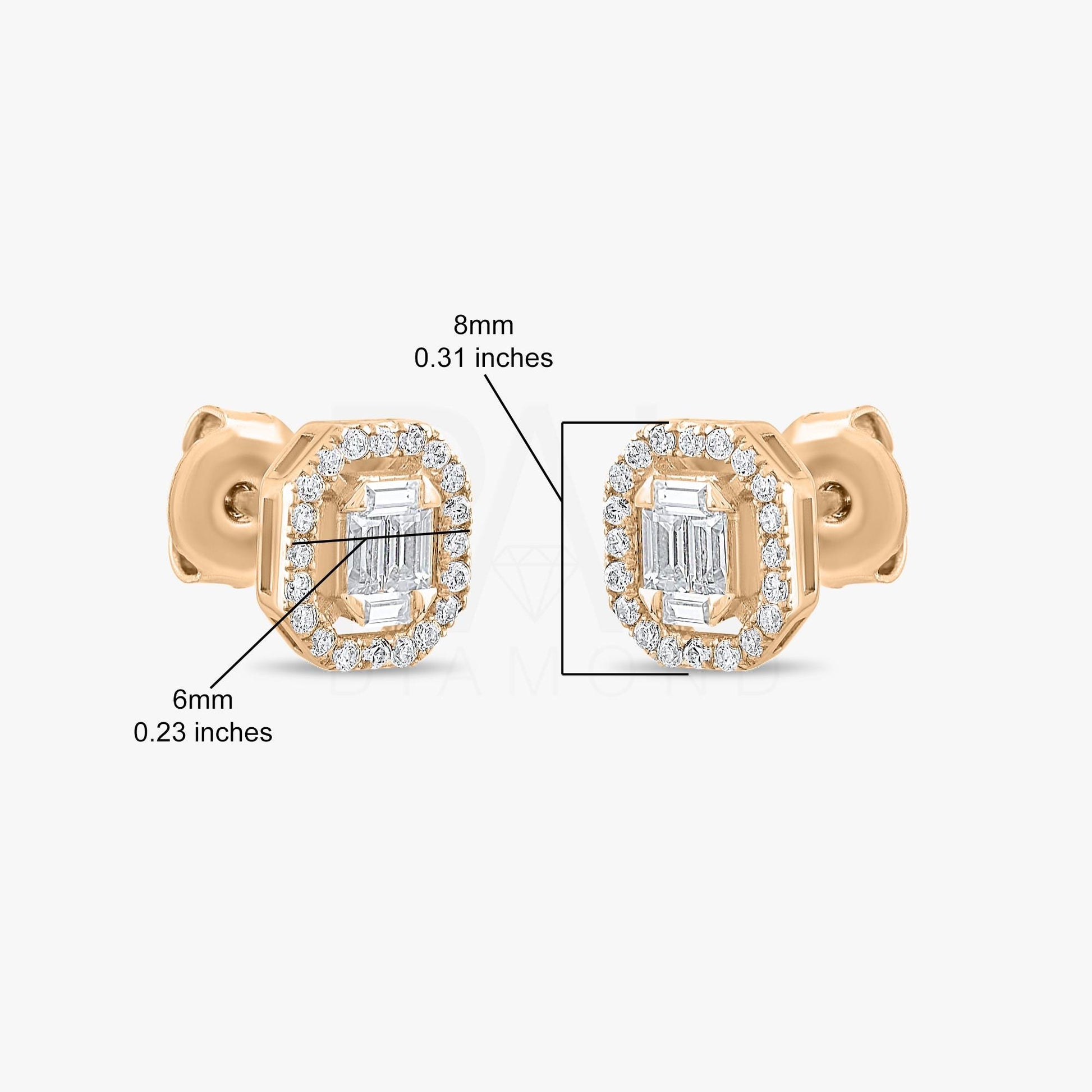 Add a touch of elegance to your collection with these exquisite diamond baguette earrings. Featuring beautifully arranged baguette-cut diamonds, these earrings are surrounded by a halo of sparkling round diamonds, creating a captivating brilliance. The diamond earrings are crafted from luxurious yellow gold, offering a timeless and sophisticated look. Perfect for women who appreciate understated glamour, these diamond earrings for women are an ideal choice for both everyday wear and special occasions. Elevate your style with these breathtaking baguette earrings, designed to shine with every movement.