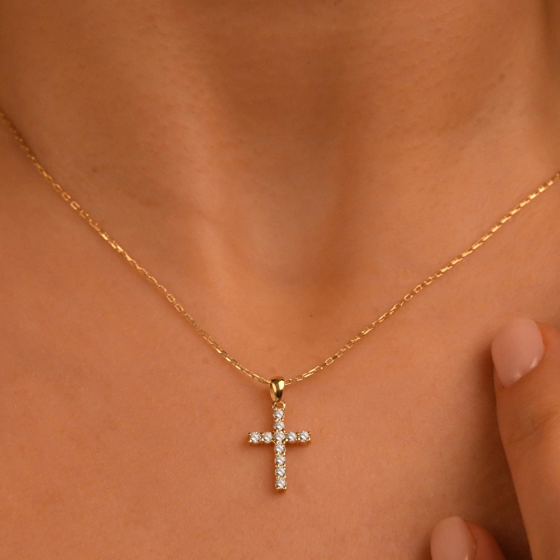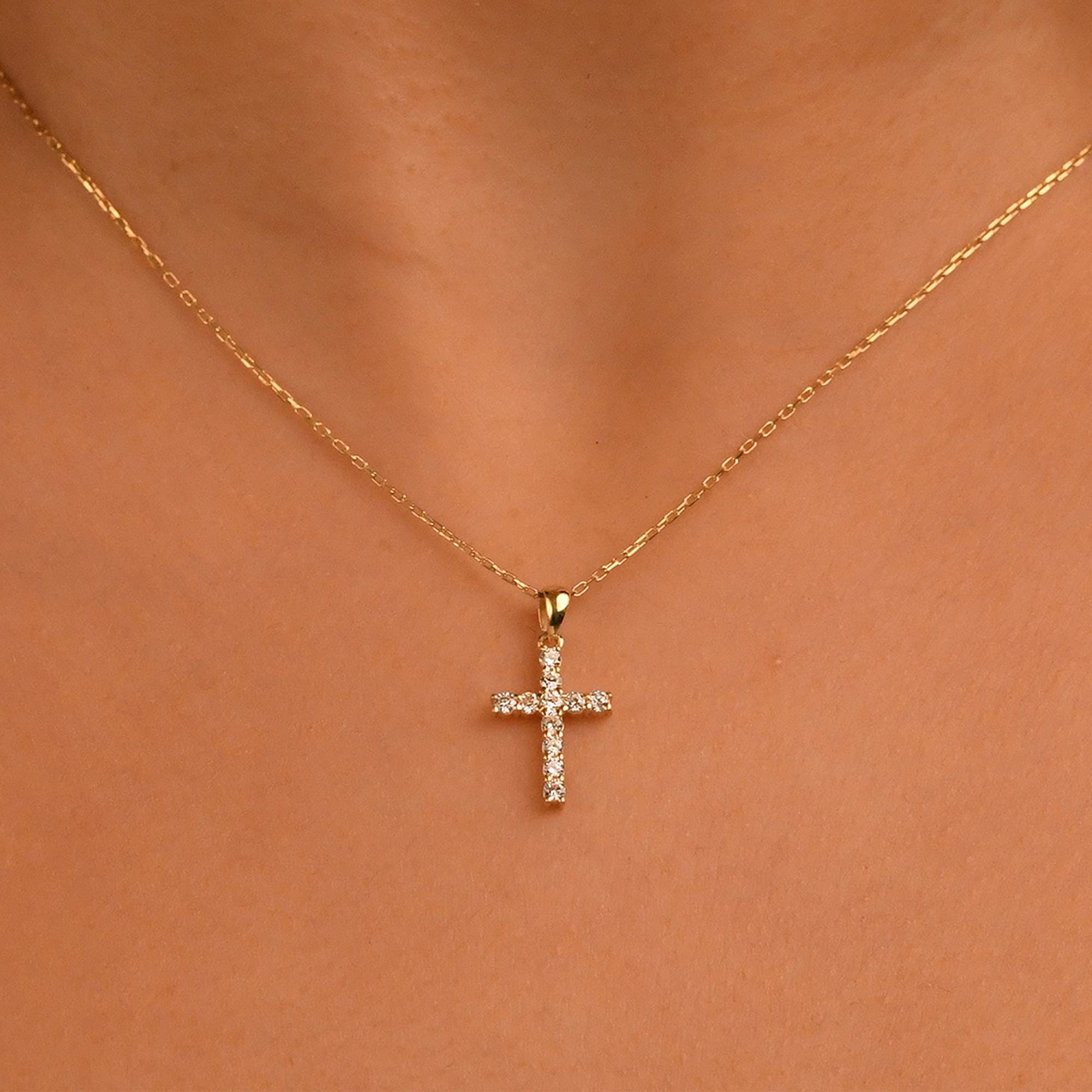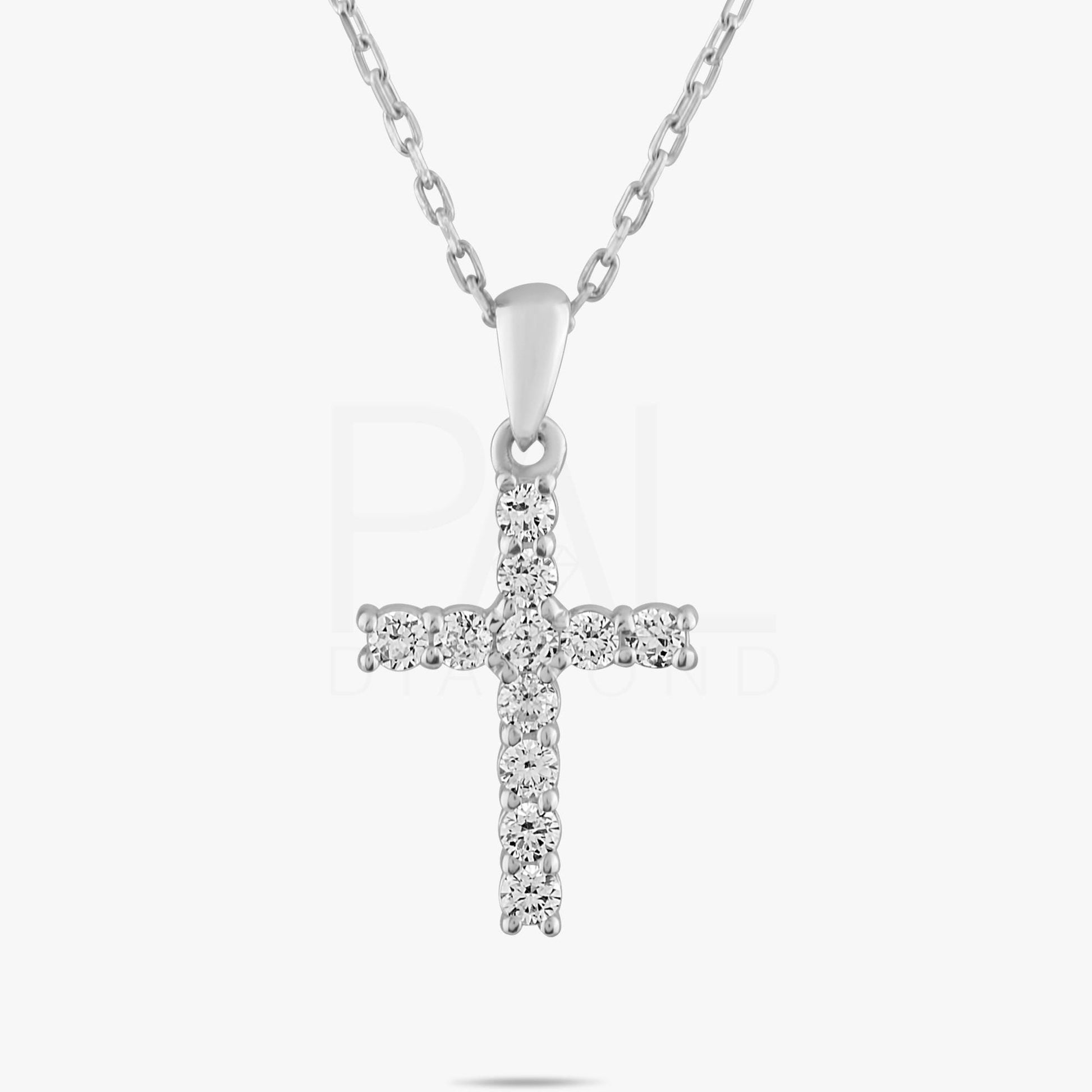 The cross measures 0.59 inches (15mm) in height and 0.37 inches (9.5mm) in width, making it a perfect size for everyday wear or special occasions. Each diamond is meticulously set, reflecting light and brilliance, elevating the beauty of this Religious Diamond Necklace.
