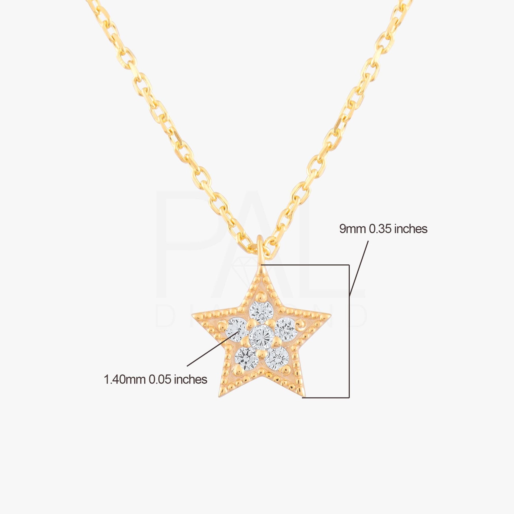 18k Diamond Star Necklace - Elevate your elegance with this stunning 14k Gold Star Necklace. The star-shaped charm, measuring approximately 9mm (0.35 inches), is delicately crafted from solid 14k gold and adorned with sparkling diamonds at its center. The diamonds, each 1.40mm (0.05 inches), are carefully set to create a radiant celestial design, making this Diamond Star Charm Pendant a true symbol of timeless beauty and grace.