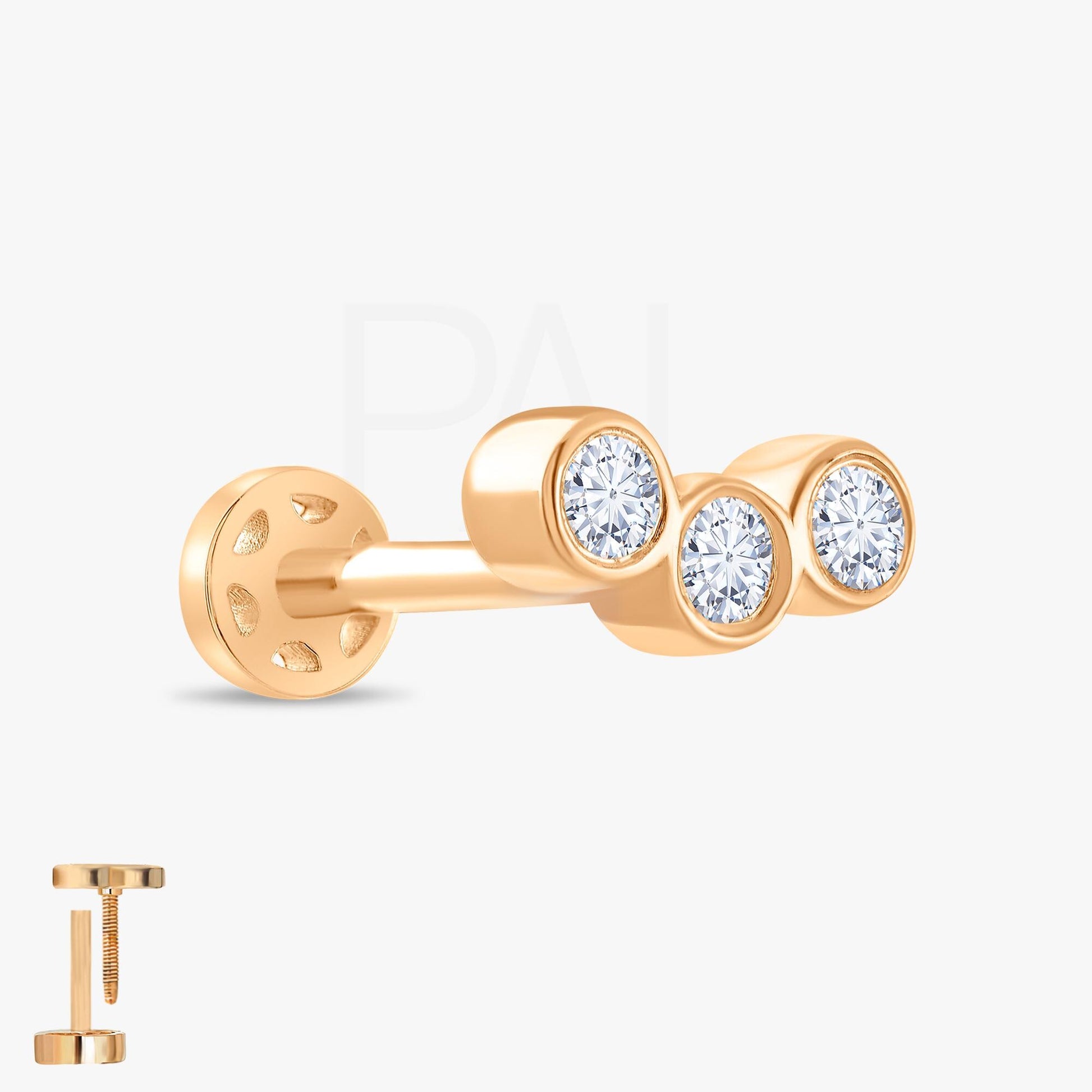 Elevate your ear game with this dazzling triple diamond tragus piercing. Handcrafted in premium gold, this chic piece features three brilliant round-cut diamonds set side by side, creating a sparkling and modern aesthetic. The minimalist yet luxurious design adds a refined elegance to any look, perfect for both daily wear and special occasions.