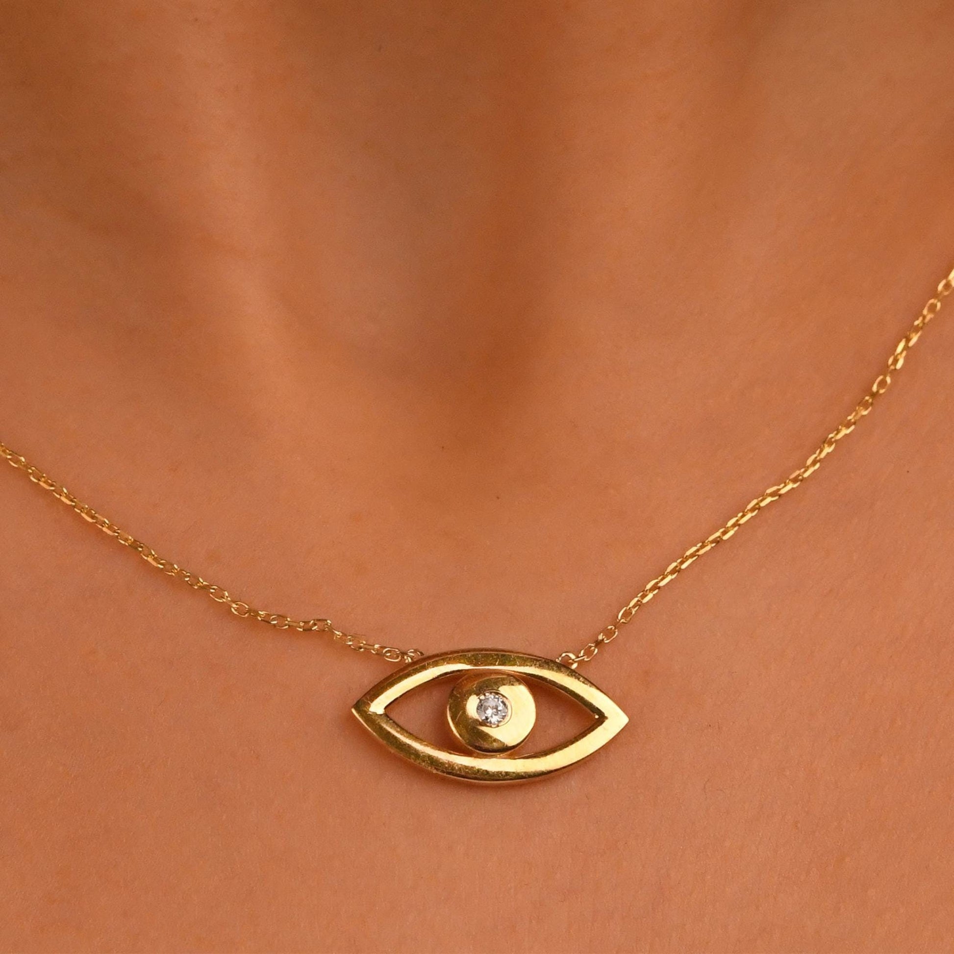 18k Gold Diamond Evil Eye Necklace, 14k Solid Gold Evil Eye Necklace, Solitaire Diamond Nazar Hamsa Good Luck Necklace, Evil Eye Pendant