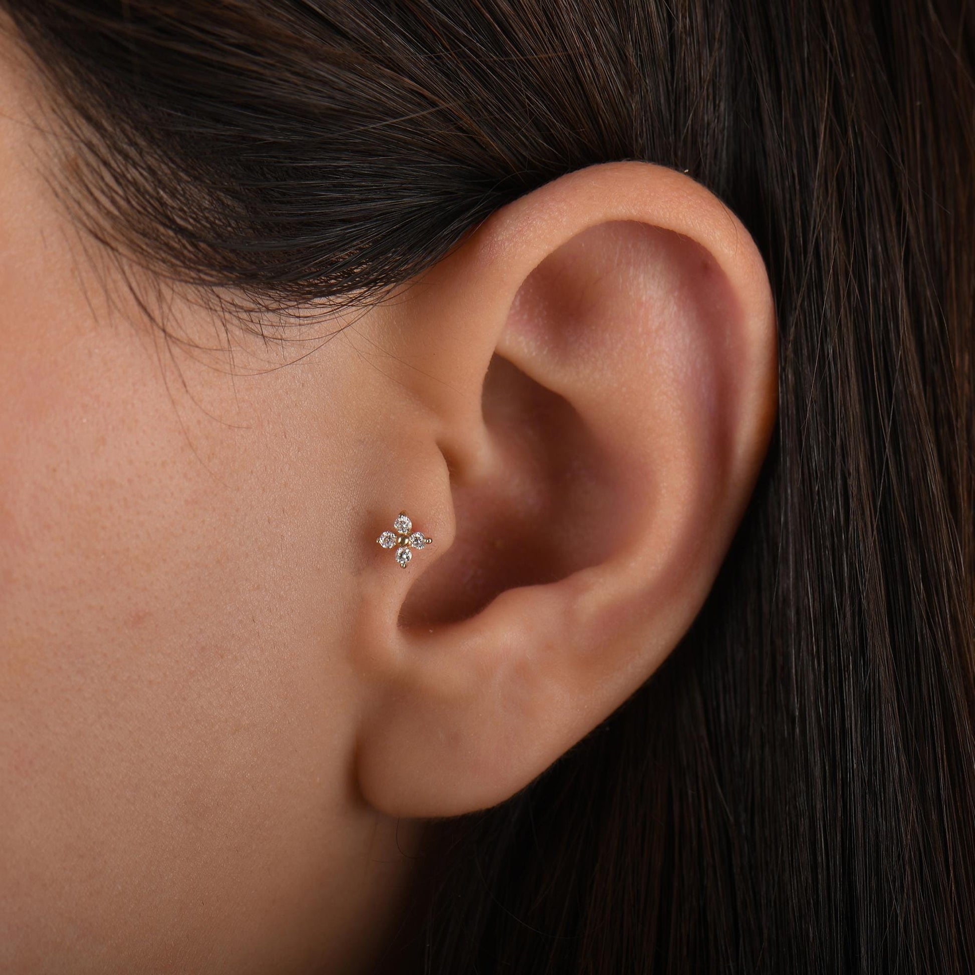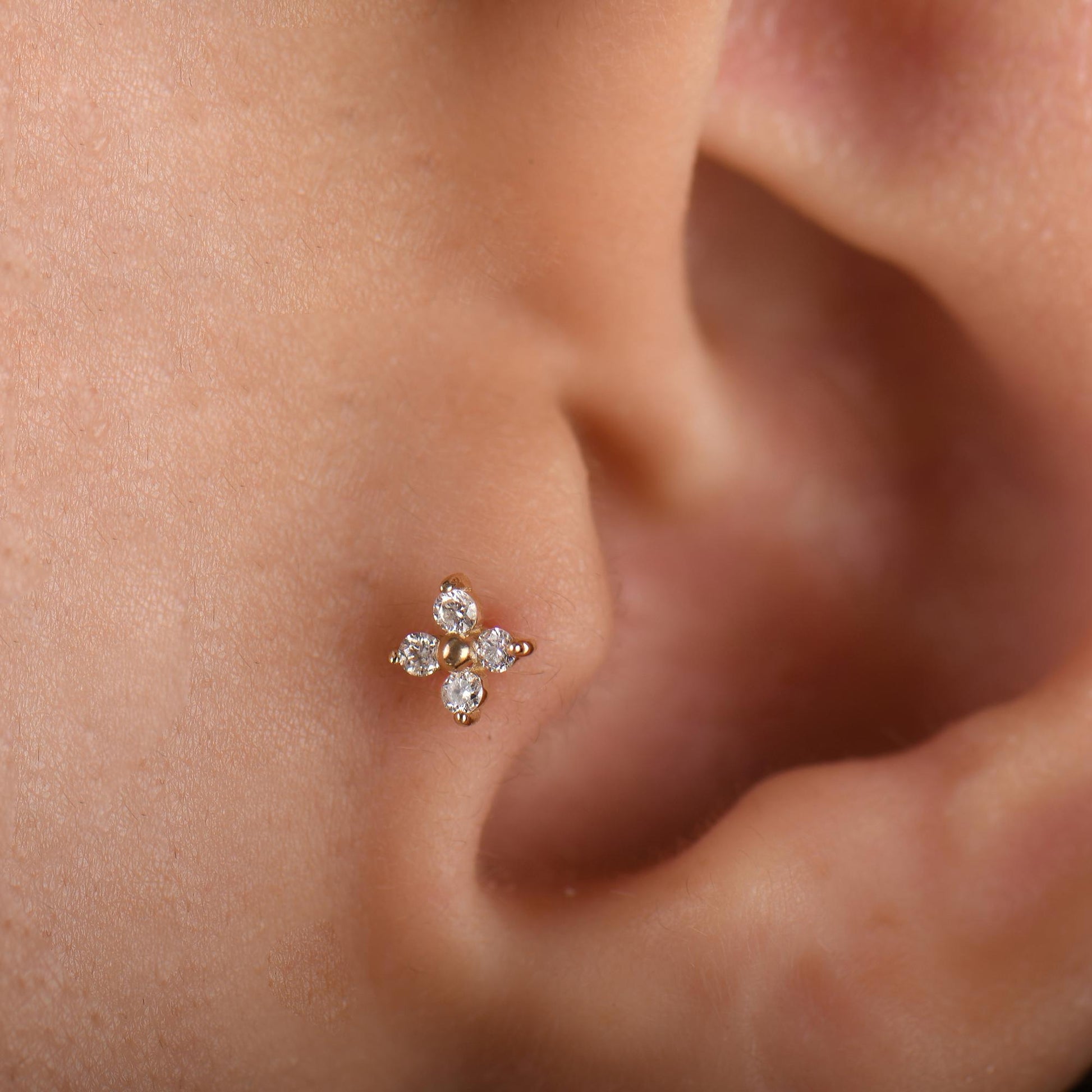 18k Solid Gold Clover Flower Diamond Tragus Earrings