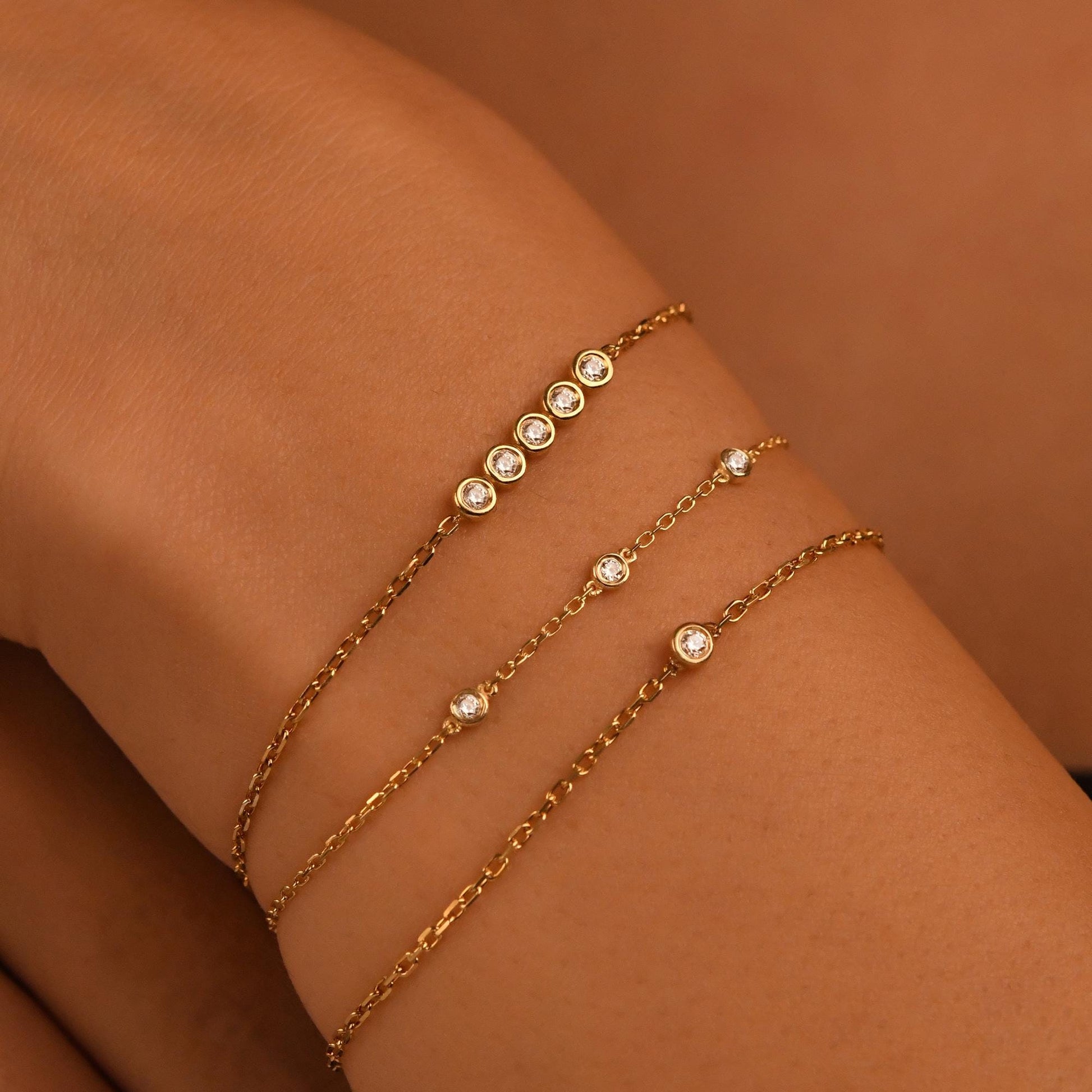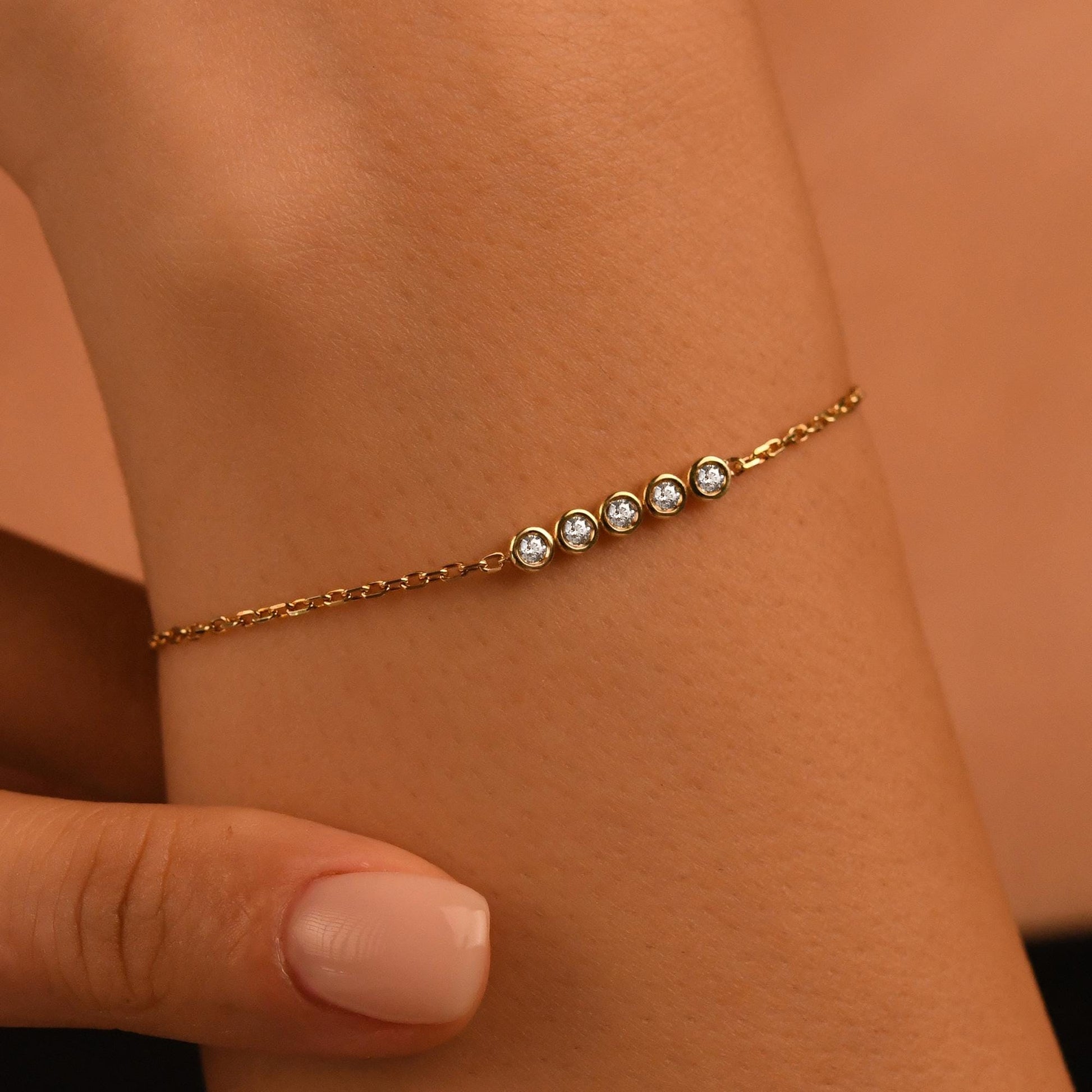 5 Stones Diamond Bracelet, 18k Solid Gold Diamond Bracelet, 14k Gold Diamond Bracelet for Women, Bezel Setting Dainty Diamond Bracelet