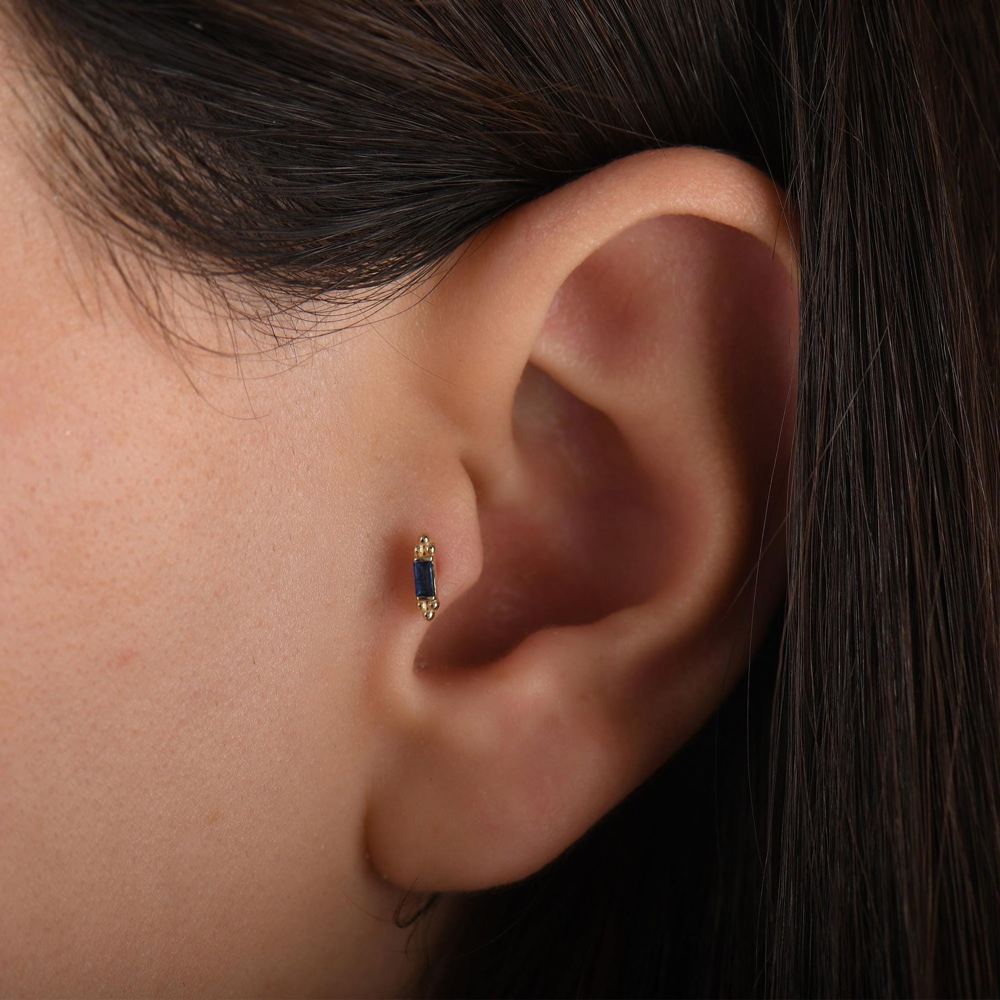 Add a touch of elegance to your style with this stunning sapphire tragus piercing. Crafted in high-quality gold, the sleek and durable design features a brilliant rectangular sapphire stone at its center, radiating deep blue hues. This piece combines the timeless charm of gold with the luxurious allure of sapphire, offering both comfort and sophistication.